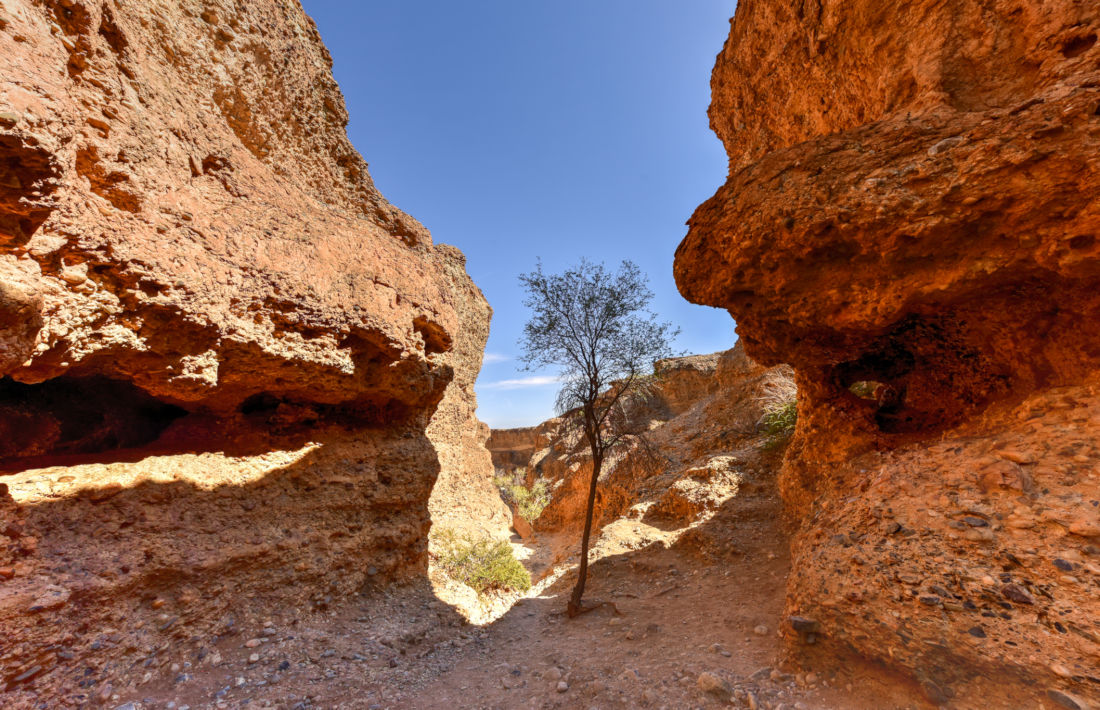 Als u een bezoek brengt aan Sossusvlei en Deadvlei in de Namib woestijn, neem dan ook de tijd om een wandeling te maken door Sesriem Canyon. De ingang van Sesriem Canyon ligt op zo’n 4,5 kilometer vanaf de ingang van het nationale park. Deze canyon is geen grote kloof zoals Fish River Canyon, maar de grillige rotsformaties waar u door heen loopt zijn bijzonder mooi. Het ravijn is uitgesleten door de Tsauchab rivier die, als de rivier stroomt, eindigt in Sossusvlei. De naam Sesriem komt uit het Afrikaans. Afrikaanse boeren die in de negentiende eeuw het gebied onderzochten hadden 6 (ses) aan elkaar geknoopte leidsels (riemen) nodig om een emmer water uit de kloof omhoog te halen. Er is altijd wel wat water te vinden in de vorm van poelen in het ravijn, maar alleen als er genoeg regen valt in de Naukluft bergen verandert de Tsauchab in een woest stromende rivier die zich door het ravijn stort. Als u in de zomermaanden december t/m februari het gebied bezoekt raden wij u aan om dan ook vooraf het weerbericht te beluisteren om na te gaan of er zware regen- of onweersbuien worden verwacht. Hevige regenval in de Naukluft bergen kan namelijk leiden tot plotselinge overstromingen. Ook hier geldt dat het erg warm kan zijn midden op de dag, plan daarom uw bezoek weer in de ochtend of late middag. De wandeling door het ravijn is makkelijk en niet inspannend, en u zult genieten van het spel van licht en schaduwen langs de rotswanden.