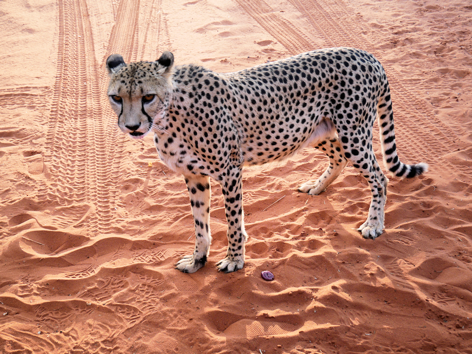 De volgende dag trokken we richting de Kalahariwoestijn. Onderweg spotten we al heel wat dieren zoals springbokken, oryxen, kudu’s en wildebeesten. Na iets meer dan drie uur rijden werden we in onze lodge verwelkomd met een drankje. Niet veel later vertrokken we voor een eerste natuurrit. Daar zagen we voor het eerst giraffen en zelfs witte neushoorns. Nadien konden we live meekijken hoe de cheeta’s in het reservaat van de lodge werden gevoederd.