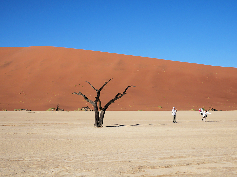 Na een eerste nacht in een permanent tentenkamp, ging de wekker om 5 uur. Op naar een absoluut hoogtepunt: de Namibwoestijn. We trotseerden de imposante duin ‘Big Mama’ en werden boven beloond met een fenomenaal uitzicht. Beneden wachtte Deadvlei: een witte kleivlakte met zwartgeblakerde, uitgedroogde bomen. We maakten ook nog een stop bij Dune 45 en de indrukwekkende Sesriem Canyon. Tegen de namiddag zochten we verkoeling aan het zwembad.